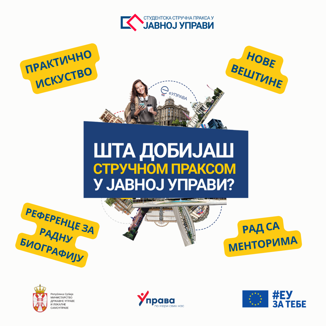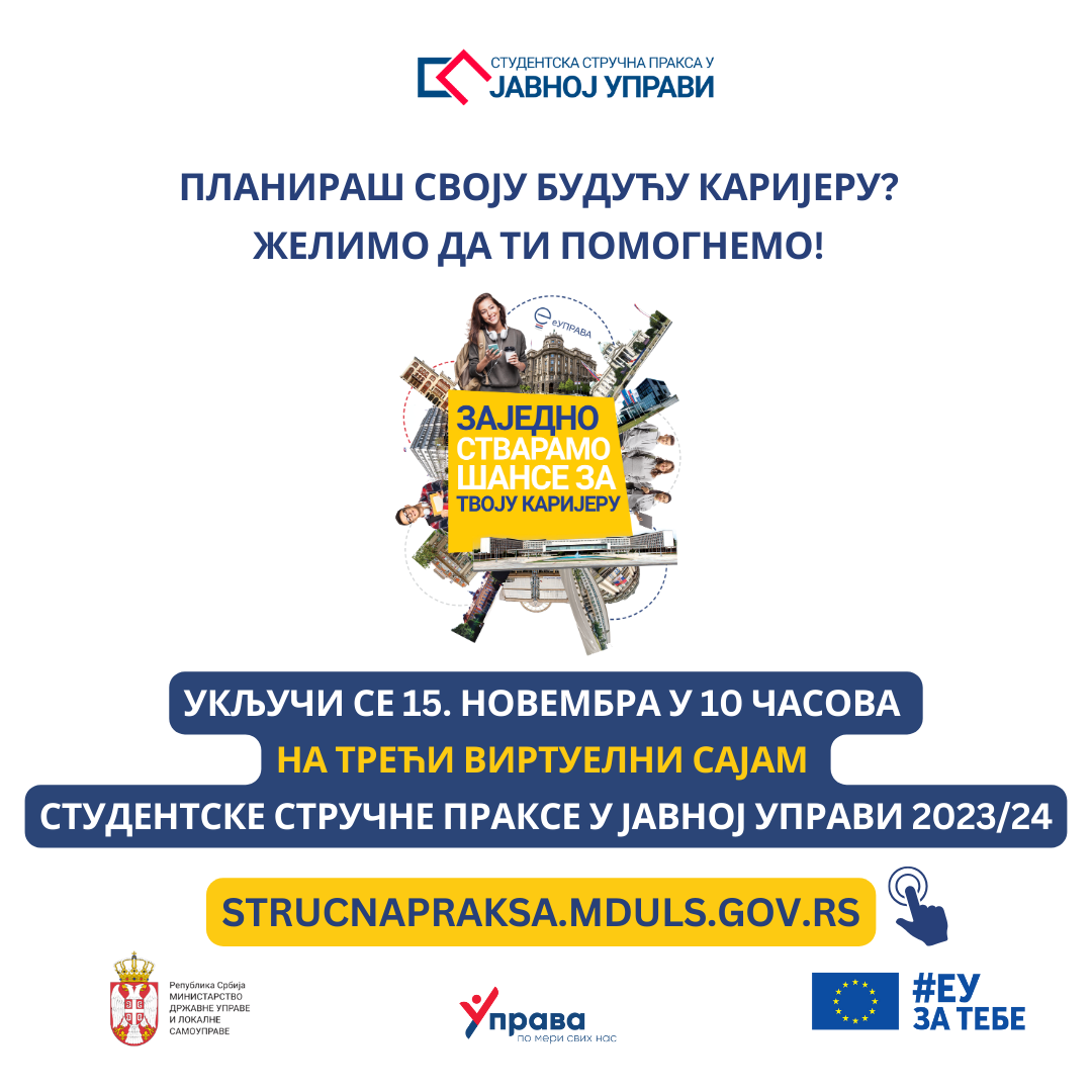 Pozivamo sve studente pet državnih univerziteta na treći po redu virtuelni Sajam studentske stručne prakse u javnoj upravi 2023/2024. koji će biti održan kao onlajn događaj 15. novembra, sa početkom u 10 časova. Na ovom Sajmu će studentima biti ponuđeno 890 mesta za stručnu praksu, u 73 organa javne uprave širom Srbije (33 grada i opštine).