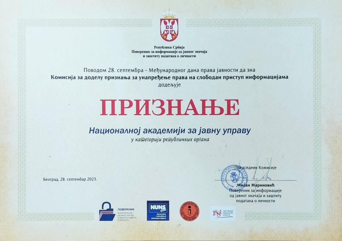 Ovom prilikom dodeljene su nagrade organima za unapređenje prava na slobodan pristup informacijama za 2023. godinu i to u kategoriji republičkih organa-Nacionalnoj akademiji za javnu upravu; u kategoriji pravosudnih organa-Višem javnom tužilaštvu u Smederevu, u kategoriji organa lokalne samouprave-organima Grada Leskovca; u kategoriji pokrajinskih organa- Skupštini AP Vojvodine. Kako je Izmenama i dopunama zakona proširen krug organa vlasti, ove godine smo uveli i nagradu za nove organe, kao što je kategorija ostalih organa vlasti koju je dobio JKP „Vodovod i kanalizacija“ Subotica. Pored toga ustanovljene su i 2 specijalne nagrade. Prvu specijalnu nagradu za doprinos edukaciji u oblasti prava na pristup informacijama od javnog značaja dobio je Pravni fakultet Univerziteta u Kragujevcu. Dok je specijalnu nagradu za izvršenje zakonskih obaveza u otežanim uslovima dobila OŠ sa Kosova „Šarski odred“, Sevce- Štrpce, imajuću u vidu da su u izuzetno teškim uslovima rada ispunili svoje zakonske obaveze koje mnogi organi iz Centralne Srbije i AP Vojvodine nisu uradili. Nagradu za poseban doprinos afirmisanju prava na pristup informacijama od javnog značaja nemamo priliku da dodelimo svake godine, ali smo je ove godine sa zadovoljstvom dodelili Stalnoj konferenciji gradova i opština (SKGO) koja je brojnim organima vlasti na lokalnom nivou, a posebno mesnim zajednicama pomogla u ispunjenju zakonske obaveze objavljivanja informatora o radu.